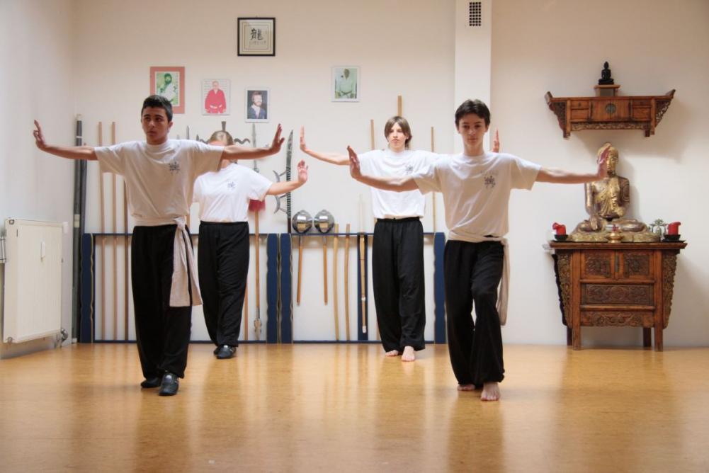 Unter erfahrener pädagogischer Leitung betreiben Kinder aller Altersgruppen Konditionstraining, Dehnungsübungen und erlernen Grundtechniken des Kung Fu.